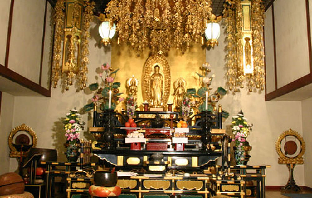 浄土宗のご本尊である阿弥陀如来です。中尊に阿弥陀如来、左に阿弥陀如来の慈悲をあらわす化身である観音菩薩、右に知恵をあらわす化身である勢至菩薩の「阿弥陀三尊」で安置されています。
