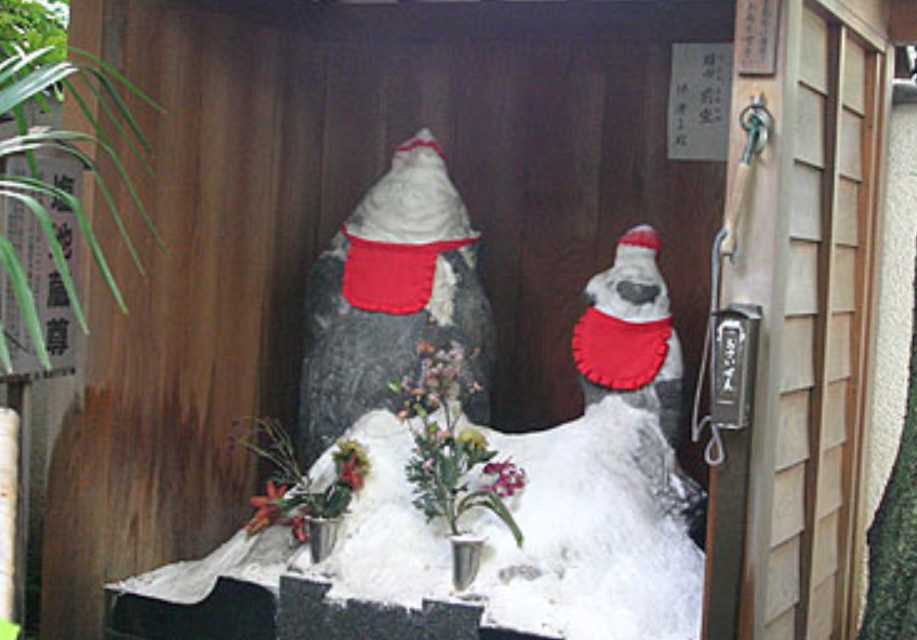 2体で1組のお地蔵さまです。お地蔵さまの体に塩をつけてお祈りすると、体の同じ部分の病気が治るといわれています。「塩」ということで、お相撲さんもお参りに来るそうです。
